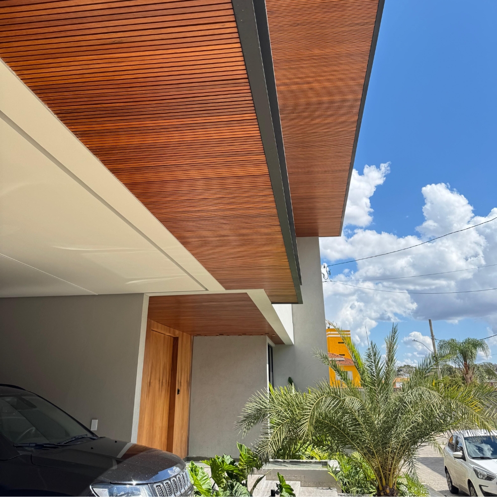 Muito versátil, o ripado pode ser aplicado em fachadas, painéis, forros e até mesmo em paredes internas, oferecendo um acabamento diferenciado e cheio de personalidade. A simetria de seus frisos realça ainda mais a beleza natural do Cumaru, uma das madeiras mais valorizadas e procuradas do mercado.