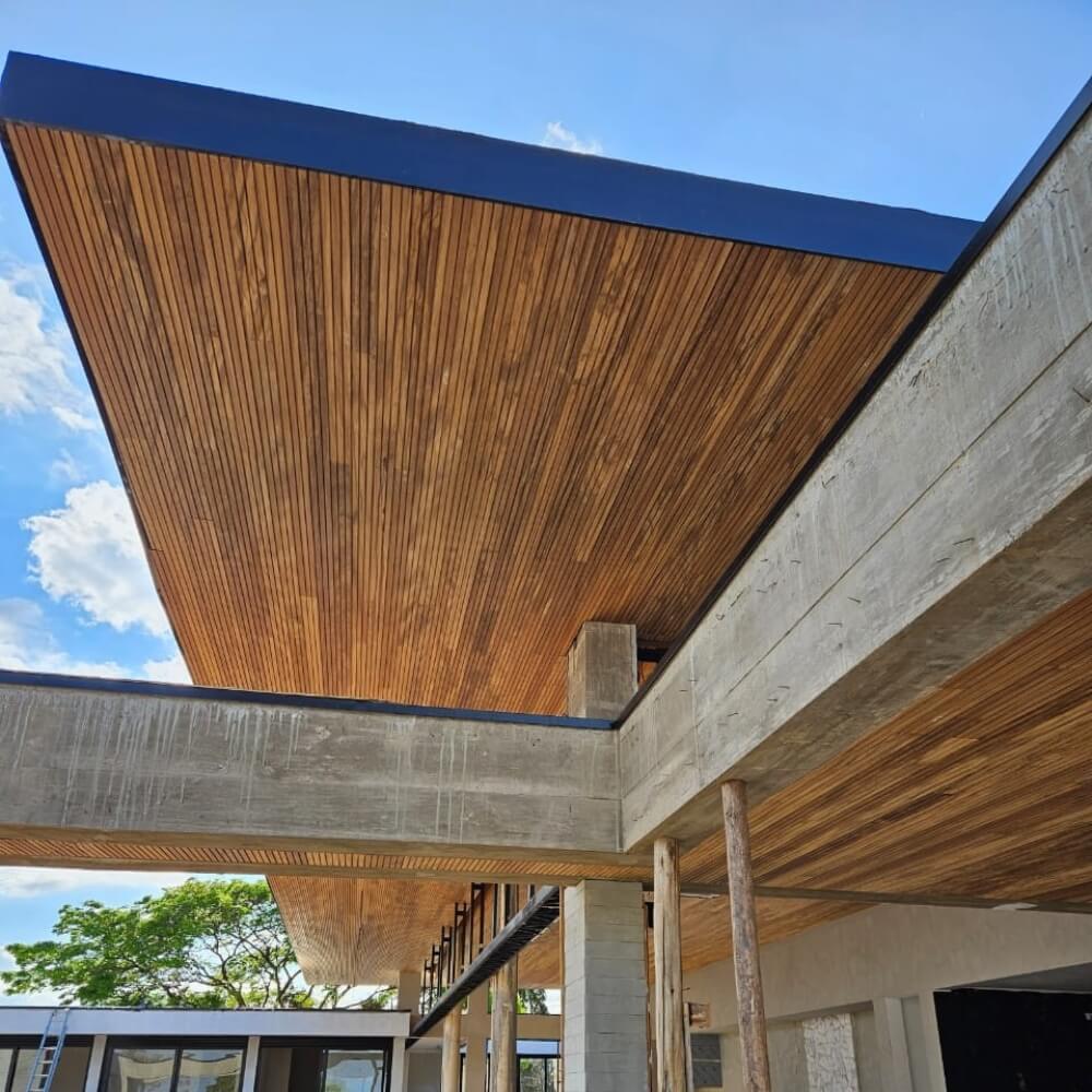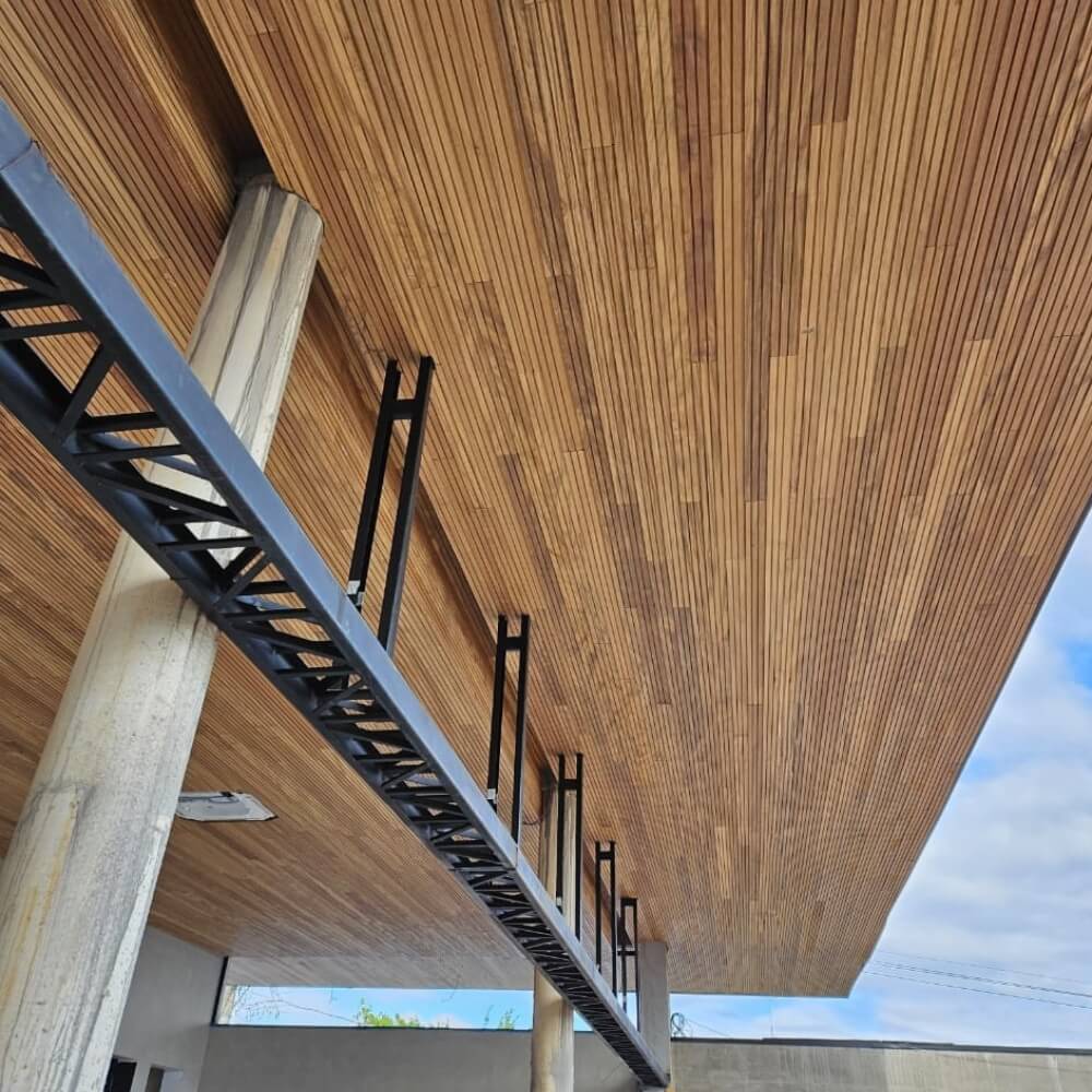 Seu design de ripas cria um visual moderno e sofisticado, perfeito para adicionar um toque de aconchego e estilo a qualquer ambiente. Seu uso é comum em projetos de alto padrão, especialmente em forros, paredes e fachadas, pois pode ser usado em áreas externas ou internas.