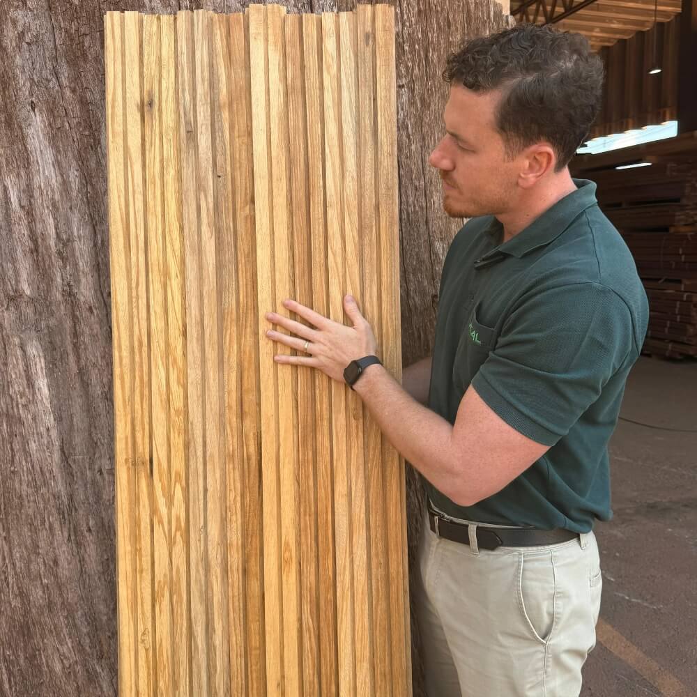 ⚠ Atenção: este ripado foi industrializado no padrão concorrência, uma solução criada para oferecer melhor preço aos nossos clientes. Isso significa que a madeira exige lixamento antes da instalação, sempre realizada por um profissional carpinteiro para garantir o melhor acabamento.