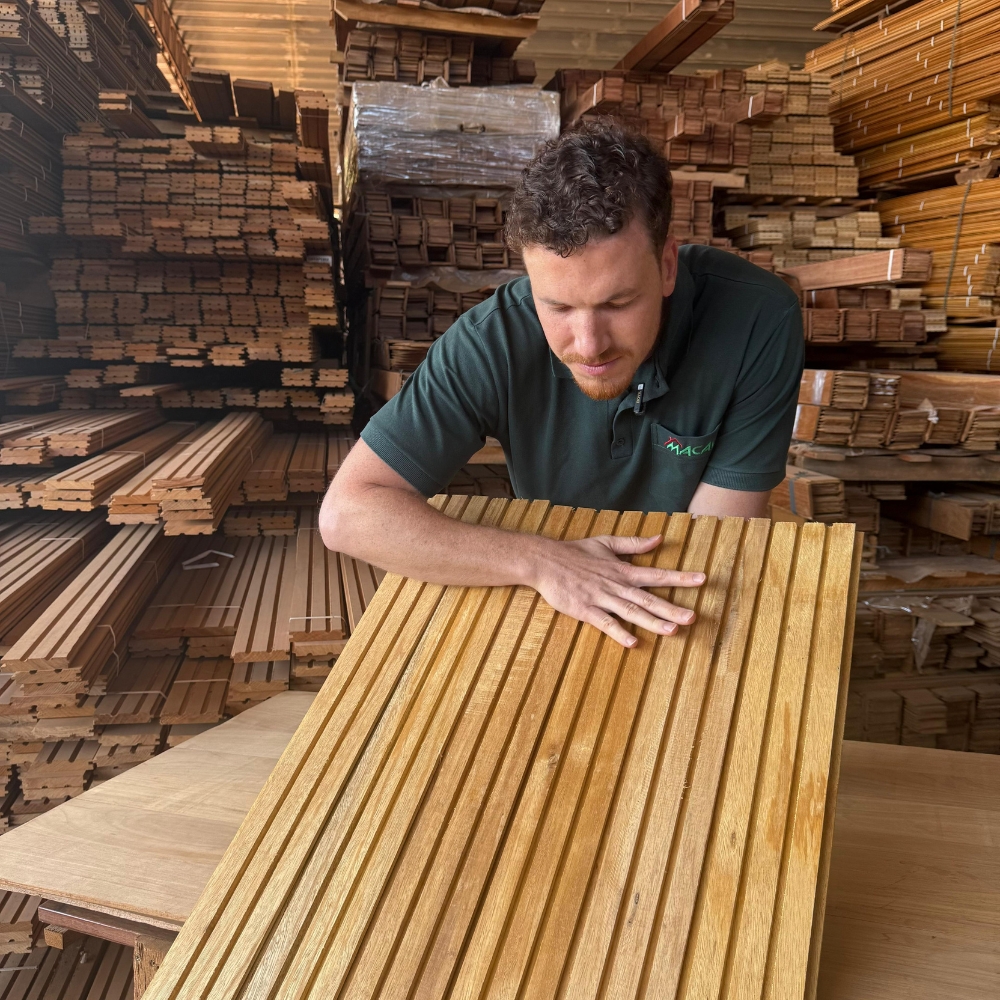 De tonalidade clara e veios marcantes, a madeira Tachi proporciona um visual sofisticado e acolhedor, agregando charme e autenticidade aos ambientes residenciais e comerciais.