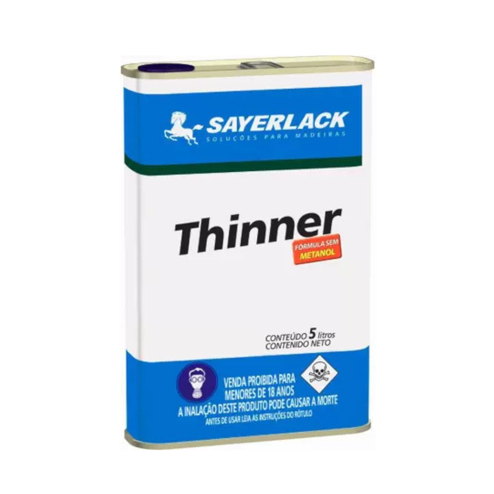 O Thinner é um diluente que serve tanto para aplicação quanto para remoção de elementos na madeira. Embalagem de 5 Litros